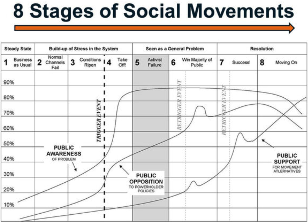 This strategy has been going on for decades, regardless of whether a narrative is built on facts. More than 35 years ago, researcher and movement observer Bill Moyer pointed out that as public awareness rises, every movement has to contend with oppositional narratives and a shift in the effectiveness of their demand platform.