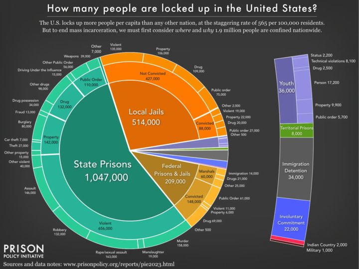 The Prison Policy Initiative released Mass Incarceration: The Whole Pie 2023, its flagship report, which provides the most comprehensive view of how many people are locked up in the U.S., in what kinds of facilities, and why. It pieces together the most recent national data on state prisons, federal prisons, local jails, and other systems of confinement to provide a snapshot of mass incarceration in the U.S.